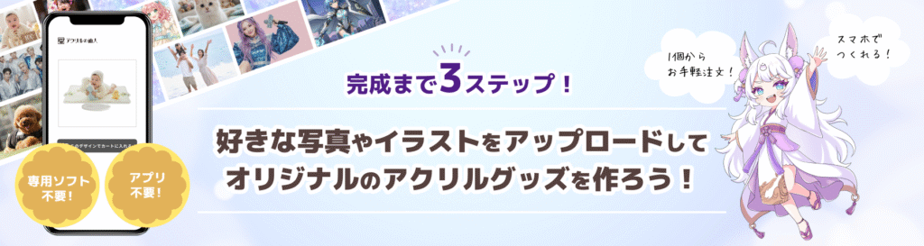 初めてオリジナルグッズを制作する方でも、アクリルキーホルダーやアクリルスタンドなどを安心して制作できます。